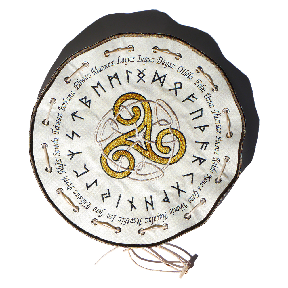 Die hochwertige Stickerei zeigt eine Triskele, die Runen und ihre Namen.